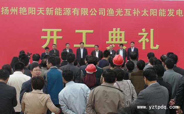 2014年4月18日,揚(yáng)州艷陽(yáng)天新能源有限公司漁光互補(bǔ)太陽(yáng)能發(fā)電項(xiàng)目開(kāi)工奠基儀式在寶應(yīng)縣柳堡仁里蕩隆重舉行。寶應(yīng)縣相關(guān)領(lǐng)導(dǎo)、上海新能源行業(yè)協(xié)會(huì)會(huì)長(zhǎng)朱元昊、揚(yáng)州艷陽(yáng)天新能源有限公司負(fù)責(zé)人、柳堡各村(居)支部書記、各部門單位負(fù)責(zé)人、柳堡鎮(zhèn)機(jī)關(guān)全體干部等參加了開(kāi)工奠基儀式。