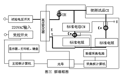 圖中除測試品CX外,其余為本儀器。細線框內部分對儀器外殼隨15KV工頻高壓5分鐘,額定耐壓10KV。儀器內附標準電容Cn,名義值為50PF,tgδ≤0.0001,耐壓10KV。高壓變壓器,額定輸出功率為1.5KVA。