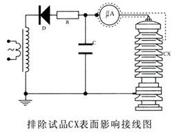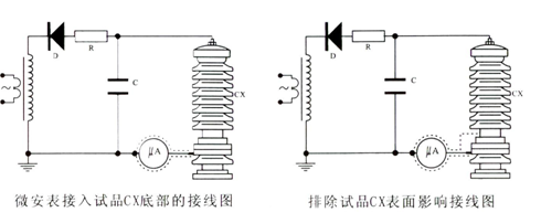 微安表必須有金屬屏蔽,應(yīng)采用屏蔽與被試品聯(lián)接。高壓引線的屏蔽引出應(yīng)與儀表端的屏蔽緊密聯(lián)接。如果被試品的表現(xiàn)污穢要排除被試品表面泄漏電流的影響可在被試品高電位端用裸體金屬軟線緊密繞幾圈后與高壓引線的屏蔽相聯(lián)接(見下圖)。