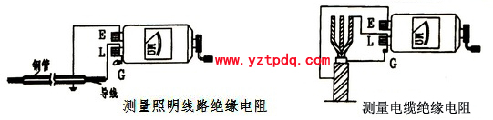 搖表(兆歐表)有三個(gè)測(cè)量端鈕,一個(gè)線路端鈕(L),另一個(gè)是接地端鈕(E),還有一個(gè)為屏蔽端鈕(G)。一般測(cè)量照片或電力線路對(duì)地的絕緣電阻時(shí),只用L和E端,接線如下左圖所示。“L”端接到被測(cè)設(shè)備的“火”或“相端”,“E”端接到被測(cè)設(shè)備的“地”端。在測(cè)量電纜對(duì)地絕緣電阻時(shí)或被測(cè)設(shè)備的漏電流嚴(yán)重時(shí),使用“G”端鈕。如下右圖所示為測(cè)量電纜絕緣電阻接線圖。