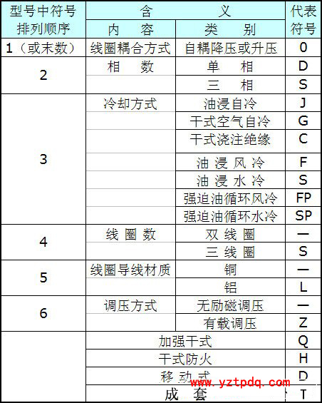 變壓器繞組數(shù)+相數(shù)+冷卻方式+是否強(qiáng)迫油循環(huán)+有載或無(wú)載調(diào)壓+設(shè)計(jì)序號(hào)+“-”+容量+高壓側(cè)額定電壓組成。