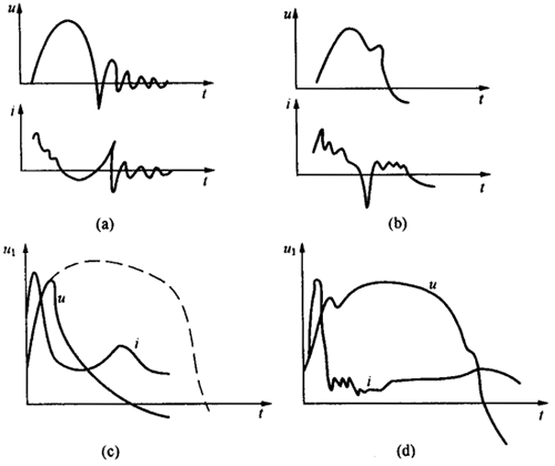 對匝間發(fā)生火花放電的情況,由于火花熄滅使電壓下跌又回升,形成一個凹陷,電流在對應(yīng)點有振蕩,整個波形無明顯變化,如圖4-9(d)所示。