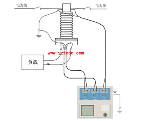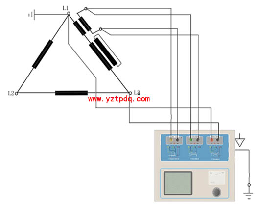 圖1-2 TPHGC-B變頻式互感器綜合測(cè)試儀在三角形接法變壓器上進(jìn)行測(cè)試時(shí)的接線方式