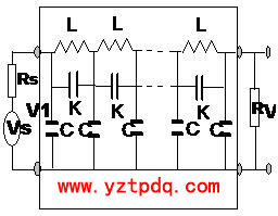 圖中:L、K及C分別代表繞組單位長度的分布電感、分布電容及對(duì)地分布電容,V1、V2分別為等效網(wǎng)絡(luò)的激勵(lì)端電壓和響應(yīng)端電壓,Vs為正弦波激勵(lì)信號(hào)源電壓,Rs為信號(hào)源輸出阻抗,R為匹配電阻。