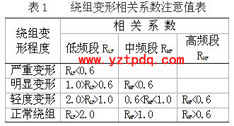 相關(guān)系數(shù)是表明兩條曲線波峰或波谷分布位置及分布數(shù)量變化的量化參數(shù),直觀地描述了頻響曲線之間的相似程度。數(shù)值越大表明兩條曲線重合度越好,越小表明重合度越差,它是判斷繞組是否變形的主要數(shù)值判據(jù)。變壓器繞組變形測試儀對(duì)相關(guān)系數(shù)的規(guī)定見表1,在實(shí)際應(yīng)用中我們發(fā)現(xiàn)其高頻段相關(guān)系數(shù)受外界影響較大,高頻段相關(guān)系數(shù)僅供參考。
