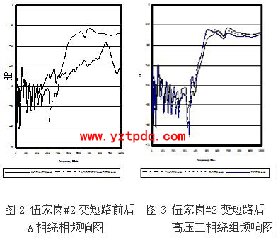 2) 電壓等級(jí)越高,匝數(shù)越多,頻響曲線吻合得越好。在兩網(wǎng)改造無載調(diào)壓改為有載調(diào)壓中,有許多老變壓器加裝了調(diào)壓變,調(diào)壓變的三相頻響曲線差別較大。