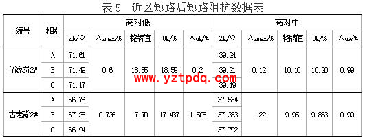 3) 2004年12月8日,雨天,10KV黃磷二回古21開關(guān)因線路接地,產(chǎn)生過電壓,導(dǎo)致10KV母線短路,古老背2#主變差動(dòng)速斷動(dòng)作,2#主變?nèi)齻?cè)開關(guān)跳閘。當(dāng)天我們進(jìn)行了繞組變形試驗(yàn),通過與歷史曲線對(duì)比,我們發(fā)現(xiàn)中低壓側(cè)頻響曲線一致性相當(dāng)好,但高壓繞組A相高頻段相關(guān)系數(shù)為1.33,分析頻響圖譜發(fā)現(xiàn)相關(guān)系數(shù)不好的原因不是波峰波谷的變化,而是A相繞組在2K頻率下幅值比歷史曲線低。短路阻抗測試結(jié)果顯示高壓對(duì)低壓三相繞組電抗值相差僅0.736%,高壓對(duì)低壓繞組短路阻抗與銘牌值相比,相差1.506%,高壓對(duì)中壓短路阻抗值與銘牌值相差0.99%,見表5。直流電阻測量也顯示無匝間或?qū)娱g短路。該變壓器原為無載調(diào)壓變壓器,在城網(wǎng)改造中進(jìn)行過無載改有載改造,將高壓中性點(diǎn)解開,拆分為X、Y、Z后外加三只套管引出,通過三根跳線引至調(diào)壓變壓器。試驗(yàn)時(shí)因雨未將架空線與X、Y、Z三只套管解開,而是直接將架空線與調(diào)壓變的聯(lián)結(jié)解開,這樣A 相繞組尾端末懸空并連有約2m長的跳線。2K頻率下繞組響應(yīng)幅值比歷史曲線下降的原因在于引線未拆除。 引線感應(yīng)電壓的影響(1#主變?nèi)栽谶\(yùn)行,相距約4米)、引線與高壓A相套管的接觸不良均會(huì)造成此現(xiàn)象發(fā)生。因此我們下出高壓繞組A相無變形的結(jié)論,目前該變壓器一直安全運(yùn)行。