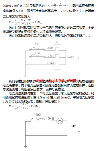 最好的解決辦法是不增大電纜截面積的情況下,應(yīng)該優(yōu)先選用200/1的電流互感器,同樣5VA的容量下允許的二次負(fù)荷為5Ω,原來(lái)的2.5mm2電纜足夠滿足要求,不會(huì)增加很多成本,同時(shí)滿足更遠(yuǎn)距離的測(cè)量要求。