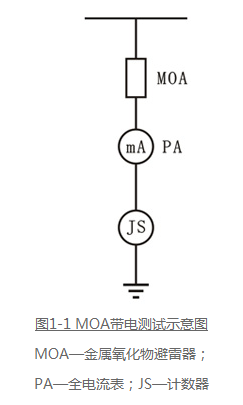 金屬氧化物避雷器目前廣泛采用一體化結(jié)構(gòu)即制造廠家在計數(shù)器前邊串一只全電流mA表,在運行電壓下測量全電流值,根據(jù)此電流值大小,判斷MOA的運行狀態(tài)。接線圖如圖1-1所示。