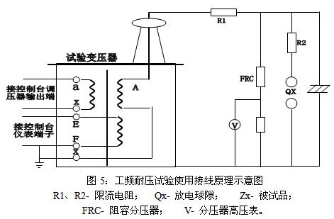1、TPSBJ系列高壓試驗(yàn)變壓器做工頻耐壓試驗(yàn)使用接線方法見圖5。做工頻耐壓試驗(yàn)前,先根據(jù)試驗(yàn)變壓器的額定容量選擇好限流電阻,(水電阻)的阻值,再根據(jù)被試品需加的高壓電壓值調(diào)整好放電球隙的球間距,為了提高對(duì)被試品施加電壓的測(cè)量精度,應(yīng)在高壓側(cè)接入FRC阻容分壓器來測(cè)量電壓。