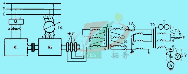 其同步發(fā)電機組基本原理接線如上圖所示。圖中,電源裝置同補償電抗器、中間升壓變壓器以及必要的外圍測量設(shè)備聯(lián)合使用。電源主要由三相異步電動機和無刷勵磁的中頻同步發(fā)電機組成中頻發(fā)電機組,再配以啟動、控制、測量和保護系統(tǒng)組成。其工作原理為中頻發(fā)電機發(fā)出定頻率(150Hz)的單相或三相交流電能,經(jīng)中間變壓器升壓,同時用補償電抗器來調(diào)整補償被試變壓器的電容性電流,以獲得所需的試驗電壓。這種工作原理和方式可以得到所需頻率的試驗電壓,電網(wǎng)電源僅用來驅(qū)動發(fā)電機組和提供直流勵磁電源,使試驗電源與電網(wǎng)電源實現(xiàn)隔離,從而消除了試驗回路來自電網(wǎng)系統(tǒng)的干擾,無刷勵磁方式也大大降低了電源本身的干擾水平,因此在做感應(yīng)耐壓的同時,也可進行局部放電測量。