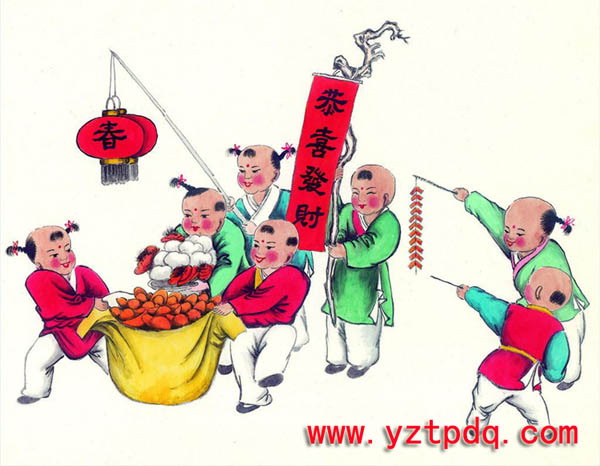 送灶以后,就真正開始了年貨的采購與囤積,貼春聯(lián)、貼門神、貼福字、貼年畫,這些寓意吉祥的大紅色的紙張給新年帶來了無處不在的喜氣與熱情,往往舊式有前后門的房屋會(huì)在前門貼春聯(lián),后門貼門神畫——唐朝初年的兩位大將秦叔寶和尉遲公。據(jù)說大門上貼上這兩位門神,許多妖魔鬼怪都會(huì)避而遠(yuǎn)之,而小孩子們則是對(duì)這兩位形象頗有點(diǎn)猙獰的門神既怕又敬、既畏又尊,很是有趣。家里屋內(nèi)的墻壁或房門上貼得都是些喜氣洋洋的年畫,比如麒麟送子、和氣娃娃等,現(xiàn)在的家庭大多以一卷卷漂亮精美的掛歷取代了各種花花綠綠的年畫,而“福”字卻貼得多了起來,那是因?yàn)樵絹碓蕉嗟纳碳覀冊(cè)敢庠谛履曦浧分袏A上一兩張“福”字作為贈(zèng)品,“福”字得倒著貼在門或窗戶上,這樣過路的人們看見了,會(huì)指著說“福”倒了,那么福就真的要到了哦。