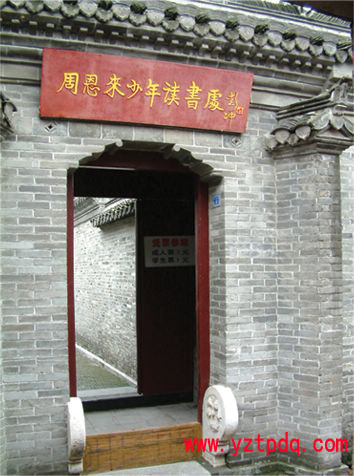 周恩來少年讀書處位于揚(yáng)州市寶應(yīng)縣城水巷口3號(hào),原為周恩來外祖父陳沅的宅第。整個(gè)建筑為明清風(fēng)格,占地700平方米,建筑面積500平方米,共有房屋十八間。讀書處人門朝北,門樓古樸莊重,門楣上方是原全國人大常委會(huì)副委員長彭沖親筆題寫的“