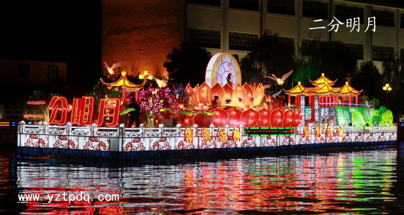 由蜀岡—瘦西湖風(fēng)景名勝區(qū)制作的領(lǐng)航花船“二分明月”號(hào)。該花船以國(guó)家5A級(jí)風(fēng)景區(qū)蜀崗—瘦西湖為藍(lán)本建構(gòu)。風(fēng)姿卓越獨(dú)樹(shù)一幟的五亭橋,寓意著幸福年年,代表著人類的智慧與巧思。皇家珍藏移步換景的白塔,見(jiàn)證著鹽運(yùn)的發(fā)達(dá),代表著至高的榮耀與尊寵。亭臺(tái)軒榭、層巒疊嶂、青山掩翠、桃紅柳綠,好一個(gè)荷塘月色,人間仙境。