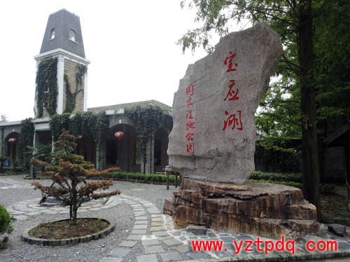 八寶亭坐落在城中心的縱棹園里。進(jìn)了素磚。高瓦的園門,走過垂柳依依的石路,踏上溪流涓涓的小橋,那飛檐翹角、凌然欲飛的八寶亭就躍入了你的眼簾。遠(yuǎn)遠(yuǎn)地,趙樸初先生書寫的餾金大字“八寶亭”赫然醒目。拾階而上,佇足亭內(nèi),八面來風(fēng),近聞鳥語花香,遠(yuǎn)眺旭日東升,悠悠然如臨仙境。