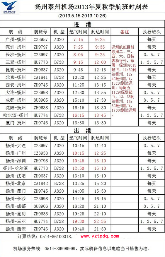 2013年5月15日起,揚州泰州機場開始執(zhí)行最新夏秋季航班時刻表(具體如下表)。市民如有疑問,請打機場服務熱線0514-89999999咨詢。機場訂票熱線為0514-86100318。
