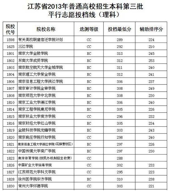 2013年8月3日上午,江蘇省考試院公布了《江蘇省2013年普通高校招生本科第三批平行志愿投檔線》,詳文見下:
