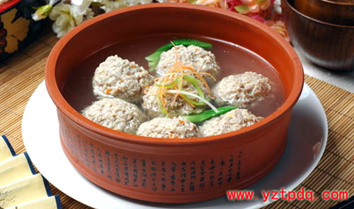 “獅子頭”,即揚州話說的“大斬肉”,北方話叫“大肉丸子”或“四喜丸子”。據(jù)說它的“遠(yuǎn)祖”是南北朝《食經(jīng)》上所記載的“跳丸炙”(《齊民要術(shù).炙法第八十》)。
