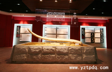 走進(jìn)寶應(yīng)博物館,一進(jìn)一樓大廳,就能看見一根象牙,長(zhǎng)420厘米,最大直徑22.2厘米,淺白色,月牙狀彎曲,表面平滑,為國(guó)內(nèi)出土同類化石之最,堪稱“中華第一牙”。這根象牙是2003年9月在寶應(yīng)夏集鎮(zhèn)境內(nèi)出土的,是一個(gè)古菱齒象牙化石,古菱齒象比猛犸象要大20萬(wàn)歲,體型比猛犸象還要大,是當(dāng)時(shí)地球上顯赫一時(shí)的“大象家族”。