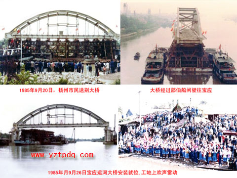 在揚州水利局檔案室內(nèi),記者看到一份檔案寫著這樣的文字:20世紀(jì)50年代后期,揚州大運河改道由灣頭瓦窯鋪至六圩入江,為方便運河兩岸交通往來,1960年6月建成揚州京杭運河大橋。橋?qū)?2米,行車道寬7米,長194米,計有7個孔,中間為通航孔,凈跨50米,系鋼筋混凝土系桿拱,其余6孔為長20米的“T”型梁,是當(dāng)時揚州區(qū)境內(nèi)規(guī)模最大、技術(shù)標(biāo)準(zhǔn)最高的公路橋。1985年9月在原橋南側(cè)新建的運河大橋,與改造后的老橋合并為一體,原來大橋的系桿拱成了“廢物”,寶應(yīng)正打算建大橋,于是決定整體搬到寶應(yīng)。