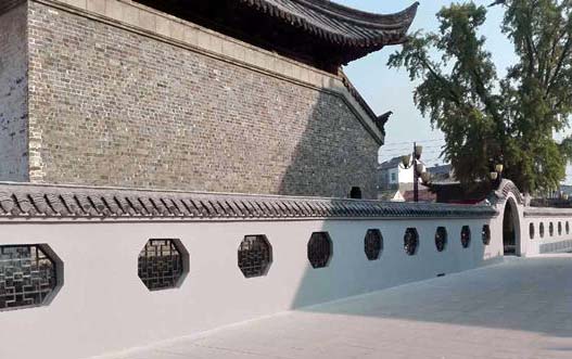 二期工程主要包括學宮圍墻的建立。因寶應學宮在寶應城中小學內(nèi),為保證學生的人身安全,同時也出于保護古建筑的目的,寶應學宮在大成殿和明倫堂的外圍建立了仿古圍墻。整個圍墻仿明清時代建筑風格,建造的扇形拱門鑲上了花邊屋檐,引人入勝,更仿造古典園林造園藝術,在圍墻上裝上了花格窗,以達到“移步換景”的目的。透過花格窗向里看寶應學宮,更別有一番風味。