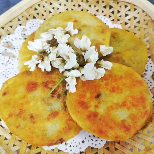 昨天 恰巧看到有人拿竹竿打下了好多槐花,我統(tǒng)統(tǒng)買了回來,足有8斤多!回來后請廚師用清水洗凈,用鹽水浸泡,揉面焯水,裹調(diào)拍打成形,兩面煎烤,一塊塊槐花餅受熱膨脹,香氣四溢!不由得垂涎滴襟腸肚慌,眾人爭相把餅嘗。咬一口松軟彈牙,嚼著嚼著清香可口,唇齒間留住了春天的味道,妙不可言!淡淡的槐花和雞蛋的香味,讓你的味蕾綻放開來,那種焦、香、酥、脆的感覺會讓你久久不能忘懷!嚼著嚼著,眼前浮現(xiàn)童年時的光景,小河脈脈,蛙聲四起。也許這種悠長的懷念,就是鄉(xiāng)愁!