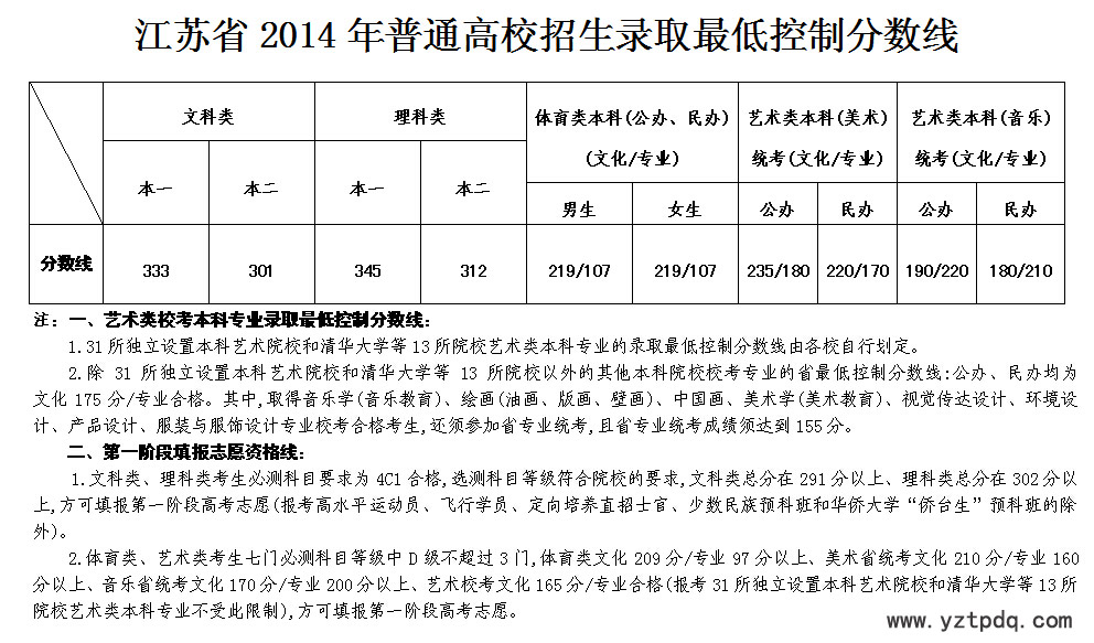 2014年6月24日下午,江蘇省高校招生委員會召開會議,審議通過了2014年江蘇省普通高校招生第一階段錄取各批次省最低控制分數(shù)線。其中,文科:一本333、二本301;理科:一本345、二本312;藝術(shù)(文化/專業(yè))公本235/180、民本220/170; 體育(文/專)男219/107、女219/107。