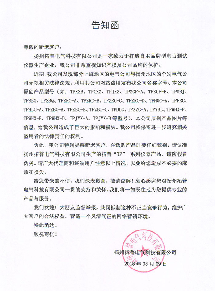 為此,我公司特別提醒新老客戶,在選購產(chǎn)品時(shí)要仔細(xì)甄別,請(qǐng)認(rèn)準(zhǔn)揚(yáng)州拓普電氣科技有限公司生產(chǎn)的拓普“TP” 系列儀器產(chǎn)品,謹(jǐn)防假冒偽劣。請(qǐng)廣大代理商和終端用戶注意以上情況,以免給您造成不必要的麻煩和損失。
